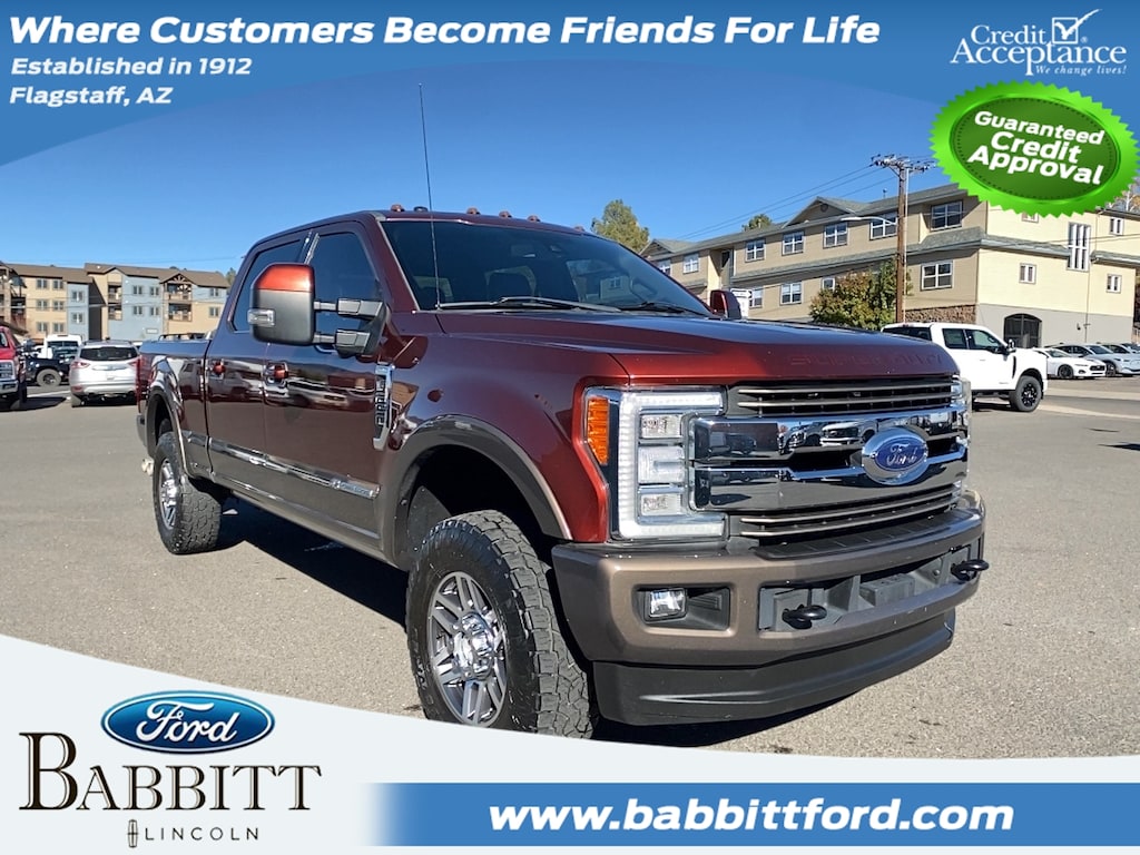 Babbitt Ford Serving the Flagstaff Community for Over 100 Years is pleased to present for sale this 2017 Ford F-250SD King Ranch as part of our hand-selected pre-owned lineup. This vehicle is finished in the Caribou Metallic exterior paint and King Ranch interior. Other factory options include: 5th Wheel/Gooseneck Hitch Prep Package, FX4 Off-Road Package, GVWR: 10,000 lb Payload Package, Order Code 700A, 4WD, 10 Speakers, 110V/400W Outlet, 4-Wheel Disc Brakes, ABS brakes, Adjustable pedals, Air Conditioning, Alloy wheels, AM/FM radio: SiriusXM, Auto High-beam Headlights, Auto tilt-away steering wheel, Auto-dimming Rear-View mirror, Automatic temperature control, BLIS Blind Spot Information System, Brake assist, CD player, Compass, Delay-off headlights, Driver door bin, Driver vanity mirror, Dual front impact airbags, Dual front side impact airbags, Electronic Stability Control, Emergency communication system: SYNC 3 911 Assist, Exterior Parking Camera Rear, Flow-Through Console, Front anti-roll bar, Front Bucket Seats, Front Center Armrest, Front dual zone A/C, Front fog lights, Front reading lights, Fully automatic headlights, Garage door transmitter, Heated door mirrors, Heated front seats, Heated steering wheel, Illuminated entry, Illuminated running boards, Leather steering wheel, LED Roof Clearance Lights, Low tire pressure warning, Memory seat, Navigation System, Outside temperature display, Overhead airbag, Overhead console, Panic alarm, Passenger door bin, Passenger vanity mirror, Pedal memory, Power door mirrors, Power driver seat, Power passenger seat, Power steering, Power windows, Power-Deployable Running Boards, Quad Beam LED Headlamps & LED Taillamps, Radio data system, Radio: Premium Sony Audio w/Single-CD/MP3 Player, Rain sensing wipers, Rear CHMSL Camera, Rear Inflatable Seat Belts, Rear Parking Sensors, Rear reading lights, Rear seat center armrest, Rear step bumper, Rear window defroster, Remote keyless entry, Security system, SiriusXM Radio, Speed control, Split folding rear seat, Steering wheel memory, Steering wheel mounted A/C controls, Steering wheel mounted audio controls, SYNC 3 Communications & Entertainment System, Tachometer, Tailgate Step & Handle, Telescoping steering wheel, Tilt steering wheel, Tough Bed Spray-In Bedliner, Traction control, Transmission Power Take-Off Provision, Trip computer, Turn signal indicator mirrors, Ultimate Trailer Tow Camera System, Unique King Ranch Leather 40/Console/40 Front Seats, Variably intermittent wipers, Vehicle Safe by Console Vault (Pre-Installed), Ventilated front seats, and Wheels: 18" Bright Machined Cast Aluminum. 4WD TorqShift 6-Speed Automatic Power Stroke 6.7L V8 DI 32V OHV Turbodiesel
